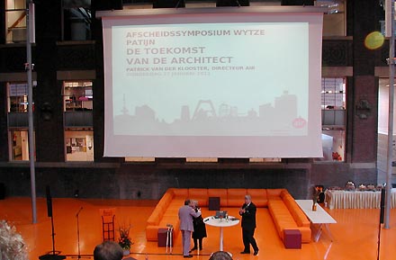 * Afscheid decaan Patijn met toekomstsymposium Gisteren zat De BOX aan bij het eerste deel van het afscheid van Wytze Patijn als decaan van de faculteit Bouwkunde in Delft. Het symposium had als titel 'De toekomst van de architect' meegekregen en er waren vier prominente sprekers om daar iets over te zeggen: de hoogleraren Winy Maas en Jo Coenen en de relatieve buitenstaanders Rudy Stroink en Patrick van 't Klooster [wij volgden de lezingen van Maas en Stroink].