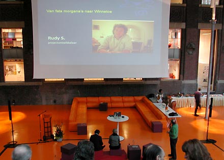 Na de lunch sprak de innovatieve ontwikkelaar Rudy Stroink [eigen introductie: Rudy S.] over de toekomst van de architect; zelf ook immers opgeleid aan deze faculteit als architect, maar al snel vertrokken naar de USA en mede daar fortuin gemaakt als projectontwikkelaar. In een glashelder verhaal over de crises vanaf 1928, via 1982 naar 2008 ['in bijna elke crisisjaar kom je wel een 2 en een 8 tegen...'] beschreef hij de wisselende - ook financiele - verhoudingen tussen opdrachtgevers, de overheid, de architect en de klant en hij besloot zijn verhaal met een enkele voorspelling over de toekomst, in zijn geval dan begrijpelijk het jaar 2028. Vooral zijn actuele visie op projectontwikkeling maakte indruk; hij stelt voor dat op 'incrementele' wijze te doen. Dat wil zeggen: investeren in bestaande grote complexen en die stapsgewijs en over een langere periode door kleine ingrepen te verbeteren en zo langzaam maar zeker nieuwe waarde te creeeren. In dat kader zag hij vooral een goede toekomst voor landschaps- en interieurarchitecten.