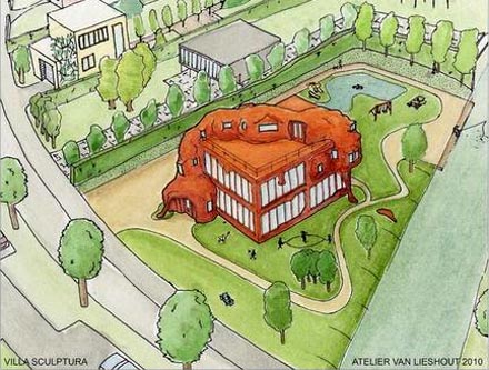 Gisteren in de Telegraaf, vandaag in de Volkskrant... Het villa-ontwerp van Atelier Van Lieshout voor een kavel in Leidche Rijn is landelijk nieuws. In opdracht van de gemeente ontwierp kunstenaar Joep van Lieshout een sculpturale villa die vanaf vandaag is de verkoop gaat. Je moet dan wel denken aan een koopprijs van minimaal een miljoen Euro. Het huis is ook nog bewoonbaar, mede door de hulp van KOW Architecten die de bouwtekeningen vervaardigt. Van Lieshout komt zelf de polyester elementen en de laatste buitenlaag van de Villa Sculptura aanbrengen.