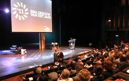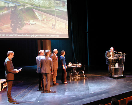 Na een uitgebreid overzicht van alle regionale genomineerden volgde de bekendmaking door landelijk juryvoorzitter Frits van Dongen. De hoofdprijs was dit keer voor Broekbakema met hun hogeschool Windesheim in Zwolle. Deze bekroning laat tevens zien dat de verjonging van dit bekende bureau, laatstelijk in 2005 met de opname van SAAS Architecten in de directie, zeer succesvol is verlopen, want het ontwerp van Windesheim kwam onder leiding van Aldo Vos tot stand. Schoorl besloot het programma met een sneak preview van de komende [en wederom positieve] landelijke publiekscampagne van de BNA. [Voor wie benieuwd is wie er in de betreffende commissie van de Raad van Cultuur verantwoordelijk waren voor het bovengenoemde advies, hier de protagonisten: Maarten Schmitt, Jeroen Schilt, Hüseyin Yegenoglu, Anna Vos, Renée Magendans en Maaike van Stiphout. Het advies zelf is te downloaden via www.cultuur.nl.] - 01 mei 2011 - BOX 1.560