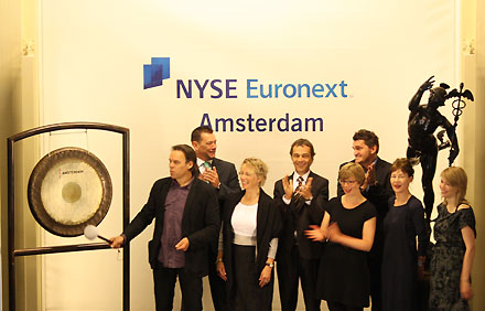 Het gebeurde waarschijnlijk volstrekt goed bedoeld; gisterenochtend mocht Rob Hendriks, waarnemend voorzitter van de Bond van Nederlandse Architecten op de gong slaan van Beursplein 5 om de handel officieel te openen... Dit alles om extra aandacht te genereren voor de komende Dag van de Architectuur. Ongewild bevestigde de architectenbond met deze handeling echter de groeiende gedachte dat architectuur kennelijk vooral een economische activieit is. Zie ook het BOX-bericht hieronder waaruit blijkt dat het woord architectuur zelfs uit het cultuurbeleid van de overheid is verdwenen en werd vervangen door de term 'creatieve industrie'. [Op de foto geheel links Rob Hendriks, vierde van links BNA-directeur Fred Schoorl en verder de vrijwel complete afdeling voorlichting van de BNA.] - 24 juni 2011 - BOX 1.568/BNA