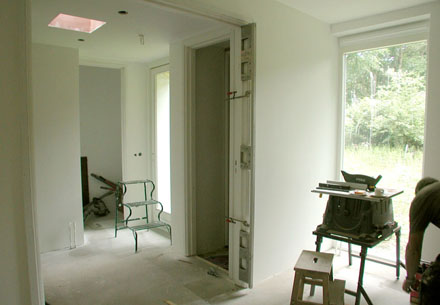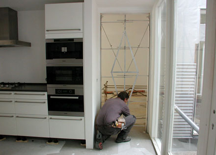 Tenslotte de derde (halve) dag waarop Arling met zijn speciale gereedschapwagentje langs de deuren ging om alle sloten, slotplaten en andere zaken zoals kantschuiven aan te brengen, wederom met gebruikmaking van verschillende - mede door hemzelf uitgedachte - speciaal gemaatvoerde of aanpasbare mallen. Kortom, het was werkelijk een feest om een dergelijke vakman tijdens zijn werkzaamheden te volgen en we raden dan ook iedere architect aan om nooit meer deuren door een gewone timmerman te laten aanbrengen, vooral als je weet dat het ook zo precies (en snel) kan... Ter afsluiting de opdracht die Tommy Wieringa voor ons schreef in zijn meest recente boek, getiteld 'Ga niet naar zee'.