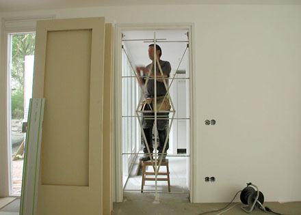 Arling begint met het overnemen van de exacte maten van het deurkozijn. Daartoe gebruikt hij een serie mallen - in dit geval die van 231,5 cm hoog - die eruit zien als een soort pantograaf die hij in alle richtingen klem kan zetten in de negge.
