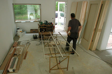 De eerste werkdag werd geheel in beslag genomen door het op deze wijze pasmaken van alle 26 binnendeuren. Vervolgens startte de tweede dag met het maken van de scharnierfresingen in deuren en kozijnen; hieronder de ook weer speciale scharniermal op het kozijn geplaatst.