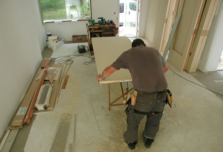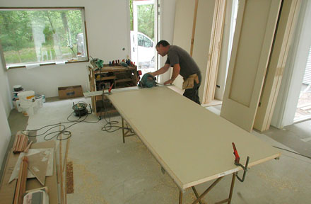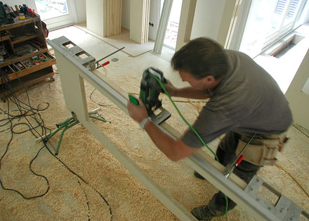 Als eerste wordt de deur ingekort. In dit geval aan de bovenzijde, zodat sloten en deurgrepen van alle deuren op precies dezelfde hoogte blijven.