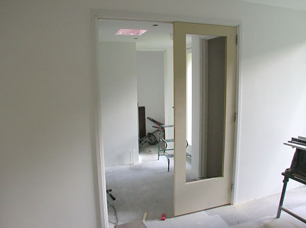 En uiteindelijk de nu aan drie rvs-scharnieren - Dulimex 89 mm hoog met kogellagers - gehangen deur.