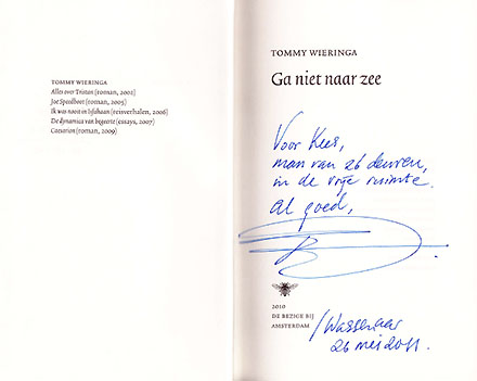 Afgelopen week geheel geoccupeerd met de verbouwing van ons woonhuis/kantoor in Wassenaar. Juist op het moment dat onze 26 binnendeuren werden bezorgd, maakten we kennis met de schrijver Tommy Wieringa in eigen persoon; hij is zes maanden 'writer in residence' aan het NIAS, een instituut van de KNAW achter ons pand in de bosrijke wijk Rijksdorp. Hij piepte even snel onze verbouwing binnen en nodigde ons vervolgens uit voor een (voor)lezing die avond in de plaatselijke bibliotheek.