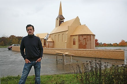 Robijns bouwde 'Het Dorp' van steigermateriaal en multiplex, zie beeld hieronder. De foto daaronder laat de echte kerk van Gotem zien. Het dorp is nog te bezoeken tot en met 30 oktober en wordt aansluitend via een veiling verkocht.