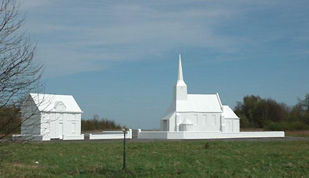 Sinds april staat er in het Belgische St. Truiden een prachtig nieuw werk van de kunstenaar Gert Robijns. Hij bouwde een witte kopie op schaal van de kerk en één huis uit zijn geboortedorp Gotem op het einde van de startbaan van een verlaten vliegveld. Het resultaat is verbluffend aantrekkelijk en vervreemdend tegelijk, hetgeen nog wordt versterkt omdat het arrangement op 60% van de ware grootte is gerealiseerd.