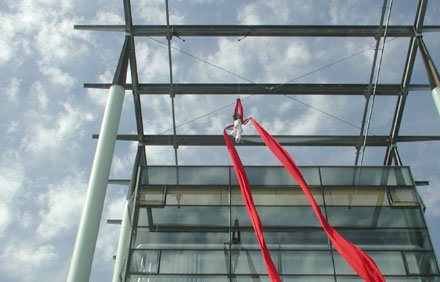 Waarna op spectaculaire wijze een in een rood lint gewikkelde dame enkele acrobatische toeren uithaalde.