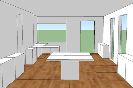 Deze week trekken we in ons nieuwe woonwerkhuis in de bossen in Wassenaar. Onderstaand de ruimte voor ons eigen werk. Hoe in te richten? We weten het werkelijk niet. Natuurlijk vele driedimensionaal getekende vooraf-pogingen maar nog niet tevreden [zie sketchup-foto].