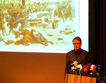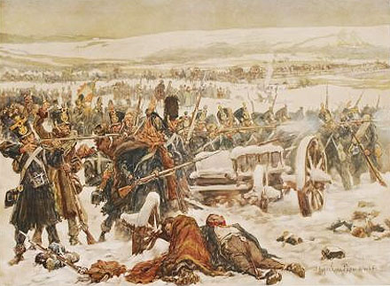 Afgelopen zaterdag werd na de opening van de expositie met foto's van Han van der Meer het nieuwe architectuurjaar 2012 geopend met de nieuwjaarsreceptie van het NAi-Museum, NAi-publishers en NAi-booksellers. De verbouwde begane grond herbergde de vele gasten en bood zo een ontspannen sfeer, waarbij vooral de lange open lijnen vanuit de hal naar het cafe aan de ene kant en de bookshop aan de andere zijde prettig oogden. Omdat het ondoenlijk is gebleken om een toespraak verstaanbaar te doen zijn in het geroezemoes van de receptie, hield NAi-directeur Ole Bouman een korte toespraak in het auditorium [zie foto boven]. Zijn eerste beeld zette meteen de toon van zijn praatje: een sneeuwrijke Isings-schoolplaat van de terugtrekking van Napoleons troepen na de slag bij de Berezina uit 1812...[zie beeld hieronder] waarbij vooral Nederlandse geniesoldaten de bruggen over de rivier hadden verzorgd.