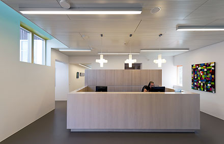 Bij binnenkomst vallen onmiddellijk twee zaken op: de zorgvuldige detaillering en de bijzondere lichtinval. Het vaste meubilair zoals de ontvangstbalie is eveneens van de hand van DLVZ/. In de centrale hal zijn de belangrijkste ontwerpthema's, de korte zichtlijnen (die altijd twee ruimtes met elkaar verbinden), de hoge plafonds en het gebruik van 'akoestisch' hout dat telkens op één vlak van plafond of wand zichtbaar is.