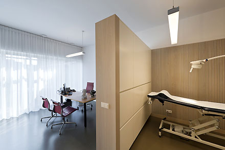 Onbetwist hoogtepunt van het gebouw is de wachtkamer die tegenover de entree ligt. Een enkele hoge ruimte, zonder direct uitzicht maar met een raam dichtbij de vloer. Daarachter liggend in de tuin een spiegelend watervlak. Door een tweede raam dat hoog tegen het plafond is geplaatst, is alleen de lucht waarneembaar. In de ruimte een lange vaste bank en een door DLVZ/ ontworpen tafel met verschillende typen stoelen. De ruimte biedt een bijzonder contemplatief karakter, bijna sacraal. Zou je hier niet automatisch dieper gaan nadenken over de reden van je bezoek?