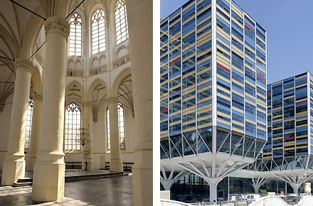 In de ontspannen setting van het Rijnlands Architectuur Platform [RAP] aan de Nieuwstraat in Leiden volgden we afgelopen donderdag een vroege avondlezing over architectuur van de in Leiden geboren auteur en NRC-Nextcolumnist Christiaan Weijts [1976]. Onder de titel 'Van Vuistbijl tot Vastgoed' deelde hij met ons de gedachtenwereld van architect Johannes Vermeer, hoofdpersoon in zijn dit jaar verschijnende nieuwe roman [werktitel 'Euforie']. Het was werkelijk een verademing om van een relatieve buitenstaander een zo beeldend en stevig onderbouwd verhaal over het archtectenvak te beluisteren... Weijts had gekozen voor een strakke chronologische opbouw en hij begon inderdaad met de vuistbijl als eerste gevonden bouwgereedschap van de mens. Waarna hij stapsgewijs de geschiedenis van de laatste 150.000 jaar doorliep en voor ons de sleutelmomenten memoreerde die onze gebouwde prestaties in het verleden hebben beïnvloed. Daarbij tevens treffend citerend uit het werk van zijn beroemde collega's als Flaubert, Nietsche en Houellebecq. Terecht stelde hij [vaak in de vorm van overwegingen van zijn nieuwe hoofdpersoon Vermeer] dat bouwen uiteindelijk een ethische opgave is, niet alleen voor jezelf dus, maar voor iedereen, en zo kwam hij als vanzelf terecht in onze eigen tijd. Met constateringen als ' Muziek en architectuur onderscheiden de menselijke activiteit nu werkelijk van de rest van de schepping' en met vragen als 'Waarom is de ruimtelijke kwaliteit van religieuze gebouwen altijd rijker dan onze recente, wereldse gebouwde prestaties?' Een en ander gelardeerd met beeldende illustraties van dat geschetste verschil, zoals bovenstaand te zien aan het Pantheon naast het Art Science Museum in Singapore van Moshe Safdie, of onderstaand en meer dichtbij het ruimtelijke kwaliteitsverschil tussen de Hooglandse kerk en het nieuwe Achmeakantoor in Leiden ['een van de lelijkste 10 gebouwen van Leiden nietwaar?']. Vanzelfsprekend zijn de bovenstaande dilemma's ook in ons vak vaker besproken en zelfs weer actueel nu ook de beroemde Britse auteur en filantroop Alain de Botton heeft besloten om die zo bijzondere ruimtelijke ervaring in religieuze gebouwen in een nieuwe vorm zichtbaar te [laten] maken in een nog te bouwen seculier gebouw in Londen [tot nu door journalisten steevast de 'tempel voor atheïsten' genoemd]. Al met al een leerzame avond voor literatuurliefhebbers maar ook en vooral voor architecten. We zien met spanning uit naar de in oktober 2012 verschijnende roman; architect Johannes Vermeer zou wat ons betreft kunnen uitgroeien tot de erudiete tegenhanger van Howard Roarke...