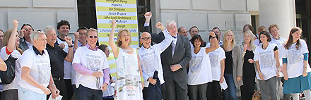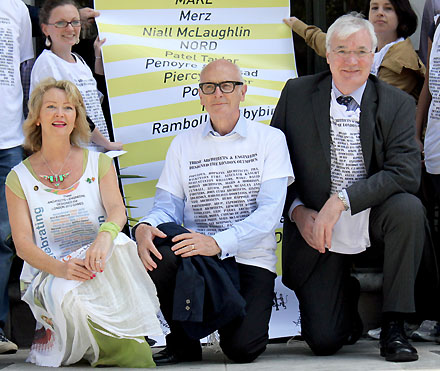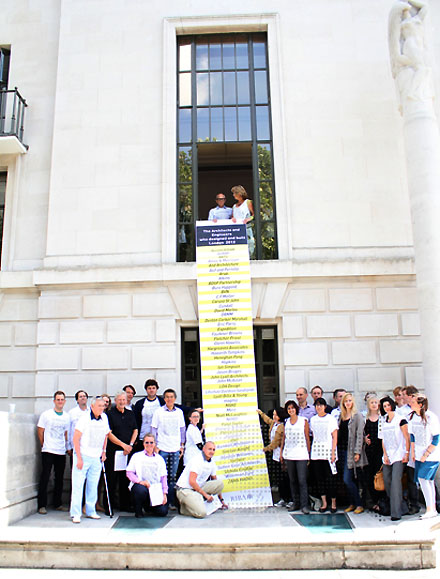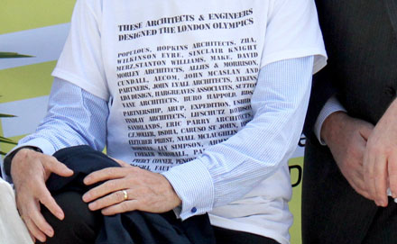 Daarom presenteerden de respectievelijke voorzitters - Angela Brady van de RIBA, Peter Murray van New London Architecture [zeg maar de Maarten Kloos van het Londense architectuurcentrum] en John Nolan, president van de Engelse vereniging van advies- en ingenieursbureaus, zie hen op de derde foto - een letterlijke namedropping van bij de Olymische Spelen betrokken architecten- en adviesbureaus. Ze gooiden een grote rolposter naar beneden en droegen allen t-shirts waarop de betreffende bureaunamen waren geprint. Het protest kreeg veel aandacht in de lokale en nationale pers, met name omdat het juist de Britse conservatieve regering was, die vooral in de richting van het buitenland goeie sier maakte met de innovatieve ontwerpen van de recente Olympic venues, zoals het stadion van Peter Cook/Populous, het Velodrome van Michael Hopkins en het Aquatic Centre van Zaha Hadid. De BOX steunt vanzelfsprekend dit ludieke protest en is onder de indruk van de gekozen vorm; wellicht een voorbeeld voor acties van de BNA in ons eigen land?