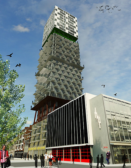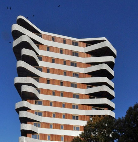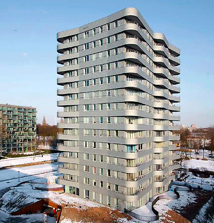 We zien een woontoren met expressieve balkons op de buitenhoeken; op zichzelf niet zo spectaculair, we kennen immers inmiddels het woongebouw de Zilverling van LEVS Architecten [zie hieronder] in Amsterdam.