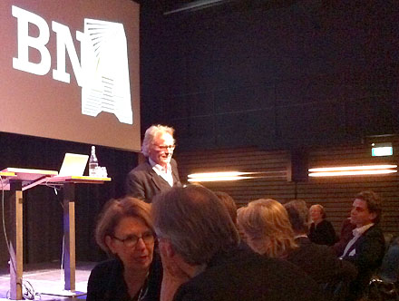 Na zoveel lariekoek noemde een kritische collega haar lezing nog netjes 'elitair gewauwel', maar de meerderheid van de toehoorders bleek juist genoten te hebben van zoveel inspiratie. En met dit soort werk wordt dus een vermogen verdiend, want de stoffenfabrikanten moet nu eenmaal de kleuren kiezen die ze over twee jaar op de markt gaan brengen. Daarom was het ook streng verboden om referentiebeelden uit dat beeldkwaliteitsplan voor de toekomst - naar ontwerp van ons culturele kruidenvrouwtje - te filmen of te fotograferen...En het plenaire deel van deze architectenmiddag was nog wel zo mooi begonnen! Zoals de opening door actueel BNA-voorzitter Willem Hein Schenk die gelukkig niet te lang stil stond bij de ellende in het vak, maar al snel enkele kansrijke strategieen besprak, zoals specialisatie met als voorbeeld Paul de Ruiter - die trouwens zojuist BNA-lid was geworden - of strategische samenwerking met als voorbeeld de succesvolle groep XS, een aantal kleine bureaus in Rotterdam. Of het betreden van nieuwe markten in het buitenland met als voorbeeld Dutch Health Architects, een tastbare samenwerking van EGM en DJGA op ziekenhuisgebied en natuurlijk zijn er veel meer nieuwe rollen voor architecten te bedenken. Tenslotte noemde hij de belangrijke BNA-acties die op stapel staan zoals de continue lobby in de richting van Den Haag, binnenkort ingevuld met een dagdeel ontmoeting met minister Blok, of het gezamenlijke werk met alle andere ontwerp- en bouwdisciplines met een komend congres in juni aanstaande.