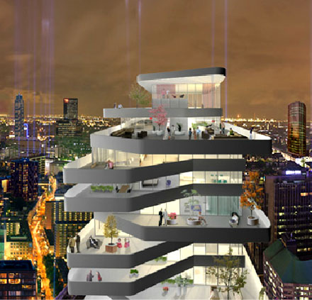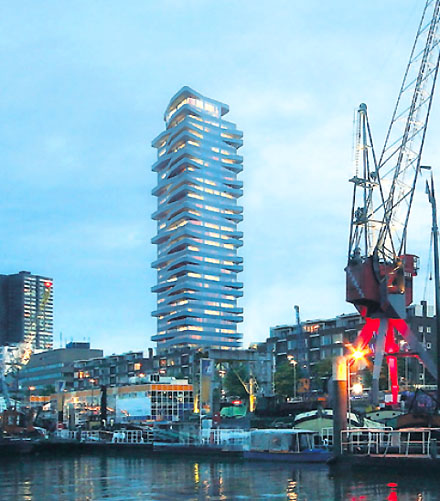 Het plan voor de toren [zie beeld hierboven en hieronder] was de winnende inzending van de hand van Casanova Hernandez Architecten in een prijsvraag op uitnodiging onder een bescheiden aantal Rotterdamse architectenbureaus in 2010. Dit alles in opdracht van ontwikkelaar U-Vastgoed en mede onder auspiciën van de gemeente Rotterdam.