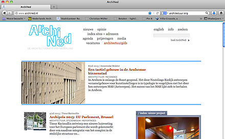 ArchiNed.nl - De eerste Nederlandse internetsite over architectuur met een groot aantal correspondenten en een nu nog tweekoppige redactie. Gestart met overheidssubsidie, maar nu reeds een aantal jaren op eigen benen. Betaald met kleine advertenties en abonnementen van leden die hun werk op de website kunnen presenteren. Ook hier vast een terugloop in abonnees. De berichten zijn vooral gericht op de culturele kant van de architectuur en ze doen dan ook niet mee aan de dagelijkse stroom persberichten van eerste palen, hoogste punten en verleende vergunningen voor nieuwe gebouwen. Begonnen kortgeleden - opnieuw gesubsidieerd - met het maken van korte video's over architecten en andere interessante architectuuronderwerpen. Wat ons betreft is video (en dus ook streaming video) de toekomst op het web, maar de kosten zijn hoog. Zelf maken we elk jaar een filmpje bij de Architect van het Jaar Prijs (kosten: een draaidag met minimaal een cameraman en regisseur, een dagje 'spotten' van de geregistreerde beelden, minimaal een dag montage met editor en regisseur en tenslotte de technische afwerking, laten zien dat je echt niet onder de 2.500 Euro terecht kunt). ArchiNed verwierf - vooral door de redactioneel bewaakte kwaliteit van de berichten - een geheel eigen plaats, maar ook voor hen is de toekomst financieel gezien niet echt rooskleurig te noemen.