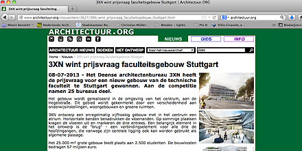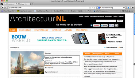 Architectuur.nl - Tja, wat moet hier je zeggen van website en blad. In retrospectief kun je in ieder geval beweren dat een van de beste en oudste vakbladen, vroeger BOUW geheten, door voormalig uitgever Reed Elsevier deskundig om zeep is geholpen. Van tweewekelijks naar maandelijks en daarna met de naam Architectuur.nl - wellicht vooral op basis van de institutionele abonnementen - nog voortgezet met nu een tiental nummers per jaar in een eigentijds vormgegeven jasje en verkocht aan uitgeverij Eisma Media die is gespecialiseerd in commerciele publicaties. Maar als je in een van de eerste nieuwe nummers een hoofdartikel wijdt aan twee partners van het daarvoor gefailleerde KOW architecten heb je van de ontwikkelingen in het architectenvak toch weinig begrepen denken wij. Soms zien we het blad nog wel eens (geen abonnement meer) maar denkelijk een aflopende zaak. De internetsite biedt ten opzichte van de concurrentie dan ook geen onderscheidende berichten. Een mengelmoes van elders geplaatst nieuws en soms een artikel uit het blad online (nog een reden te meer om geen duur abonnement te hoeven nemen).