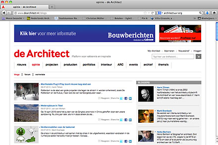 De Architect - Belangrijk en gevestigd vaderlands vaktijdschrift, dat vanzelfsprekend ook op internet aanwezig is. Naast een beperkte nieuwsrubriek met iets minder talrijke berichten is er daar een afdeling met blogs te lezen, bijvoorbeeld die van hoofdredateur Harm Tilman waar wij althans elke maandag naar uitzien. Helaas is de reactiemogelijkheid getrapt geworden, hetgeen betekent dat directe reacties en daarmee snel debat wordt uitgesteld. Er wordt dan ook nauwelijks meer gebruik gemaakt van die mogelijkheid. Ook de Architect zal het aantal nummers in print gaan verminderen en debatteert dus kennelijk intern over de toekomst. Je zou zeggen dat het nieuwe BIM Media een uitgelezen kans biedt om de voorheen gescheiden redacties van de Architect, CoBouw en Vastgoedmarkt te bundelen en nieuwe vormen van gezamelijke content te genereren voor internet en print. De dagbladvorm van CoBouw zal dan wel sneuvelen denken wij, want dat format is, mede vanwege de hoge kosten (en dus zeer dure abonnementen) denkelijk onhoudbaar. Ze werken al als combine in beurzen en congressen, maar ja, daar proberen ze dan ook nog winst te maken en dus zijn de deelnamekosten bijkans het tienvoudige van die van het Architectenwebcongres. Bij de meest recente congresaflevering van de Architect werden de laatste kaartjes dan ook verloot of weggeven (om de zaal nog een beetje gevuld te krijgen?).