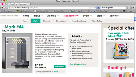 Tenslotte de vakbladen die zich mede richten op een ruimere doelgroep, en vooral mede op het buitenland. Wij lezen Mark Magazine en A10. Mark is gericht op de gehele wereld en staat werkelijk bol van nieuwe en spectaculaire beelden plus de internationale ontwikkelingen in ons vak. A10 probeert zijn/haar aandacht te concentreren op diezelfde ontwikkelingen in Europa. Maar beide hebben ze de focus op een doelgroep die het veelvoud vertegenwoordigt van de Nederlandse architectenpopulatie. In ons land 10.000 architecten, in Europa minimaal 500.000... Dus zij zullen het wellicht iets langer volhouden dan de nationale vakbladen. Maar ook daar is de formule van een tweemaandelijks blad in print in de brievenbus straks waarschijnlijk uitgewerkt.