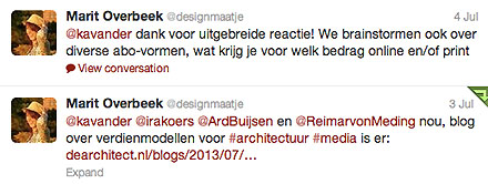 * Hoe moet het verder met de architectuur-vakpers? Afgelopen week startte Marit Overbeek, webredacteur van de Architect een interessant twitterdebatje over de toekomst van de architectuur vakpers (en daar werd door Caroline Kruit - ooit maker van het vakblad dax - direct en uitgebreid op gereageerd). Kennelijk wordt er binnen de redactie waar Marit deel van uitmaakt een debat gevoerd over nieuwe verdienmodellen in relatie tot mogelijke content, met name op hun website. Waarom juist nu zou je denken, maar de reden is wel begrijpelijk. Het tijdschrift de Architect was onderdeel van het fonds van uitgeverij SDU en die zijn kortgeleden overgenomen door een Franse uitgever. Omdat de nieuwe eigenaar eigenlijk alleen is geinteresseerd in de juridische en financiele informatie zijn de bouwgerelateerde bladen (zoals CoBouw, de Architect enVastgoedmarkt) nu ondergebracht in een nieuw bedrijf genaamd BIM Media. Je kunt daar op twee manieren naar kijken: het is een mooie etalage voor een gedachte verkoop van die bouwbladen maar de verzelfstandiging biedt wellicht ook nieuwe mogelijkheden om stevig op eigen benen te staan. Waarschijnlijk daarom ook die actuele redactionele discussie.