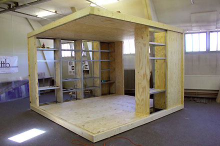En dat zelf georganiseerde bouwen is inmiddels ook in praktijk gebracht door de andere derde prijswinnaars van de 2e ronde, Jeroen van Aerle, Beerd Gieteling en Philippe Rol, nu samenwerkend in het Atelier tot the Bone in Eindhoven. Hun ontwerp voor een tijdelijke woning in een leegstaand kantoorgebouw getiteld 'Een huis van een kast' bouwen ze inmiddels zelf op een zolder in hun woonplaats, zie onderstaand beeld. Alleen de gevels ontbreken nog en ze documenteerden de bouw op hun website, onder meer met een timelapse-filmpje.