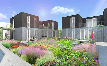 Tenslotte hieronder het nader uitgewerkte ontwerp voor een groep starterswoningen in de gemeente Oirschot van architect Kim Verhoeven uit Den Bosch. Haar plan werd uit de drie geselecteerden voor uitvoering gekozen door een jury onder leiding van wethouder Piet Machielsen.