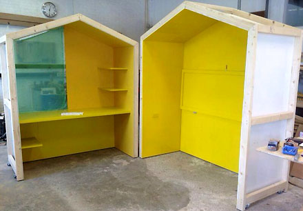 We zijn druk doende met de voorbereiding van het nieuwe seizoen 2013 van de Jonge Architecten Prijs. In dat kader is het aardig om nog even terug te blikken op de drie ontwerprondes van 2012, met alleereerst bovenstaande foto van de overall-winnaars Bokkers van der Veen Architecten uit Rotterdam. Zij wonnen de 1e en de 3e ronde en behaalden in de 2e ronde de derde prijs. Onderstaand is de bouw van hun winnende ontwerp voor de eerste ronde te zien, een werkruimte voor in de woonkamer. Ze lieten een prototype bouwen door een meubelmaker met de bedoeling om het inklapbare werkmeubel na een succesvolle introductie in productie te nemen.