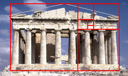 * Ventoux, een staaltje hoogstaande boek-architectuur In de architectuurgeschiedenis speelt de klassieke verhouding - anders gezegd de gulden snede - een grote rol. In vroeger eeuwen werd deze strenge maatverhouding meestal gebruikt bij de opbouw van ruimtes en bij de compositie van facades, zoals te zien aan de onderstaande foto van het Parthenon op de Acropolis in Athene. De klassieke verhouding [getalsmatig 1 staat tot 1,618..] is rechtstreeks vanuit de natuur afkomstig en is in het beeld daaronder mooi in tekening gezet.