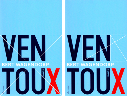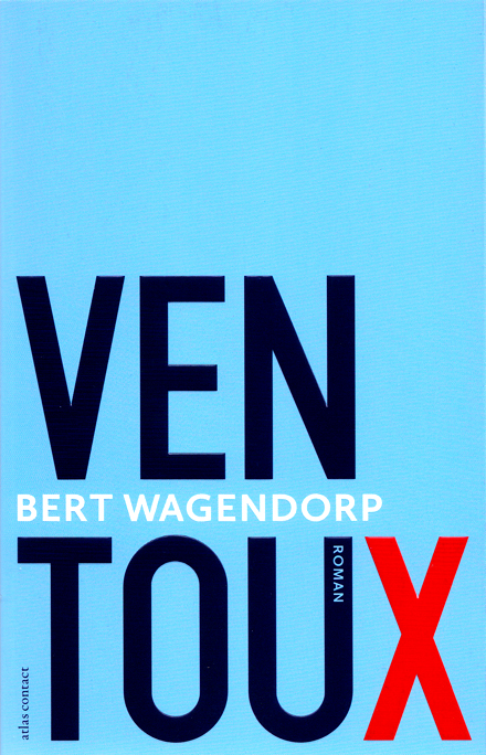 De titel Ventoux gezet in zeven staande kapitalen... Verdeeld in drie en vier, de laatste van die vier in rood, waardoor twee gelijke groepjes van drie ontstaan... die vierde, die X, waar staat die voor? voor sex, bloed, de dood? De naam van de auteur in wit en in kleiner kapitaal tussen de twee rijen kapitalen in. Voornaam Bert precies strokend met de bovenliggende horizontaal van de T uit Ventoux, de P van de achternaam eindigend bij de raaklijn vanuit de virtueel doorgetrokken linkse 'poot van de X... Het woord 'Roman' uitgespaard in de rechter poot van de U en de naam van uitgever Atlas Contact bescheiden geplaatst in de linker witruimte van de T... Kortom wat een finesse, wat een fijnslijperij, wat een mooie details.