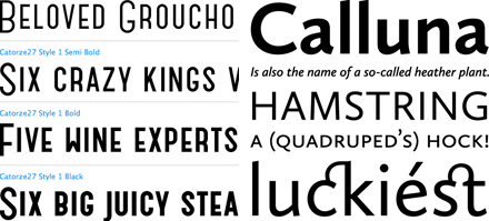 We zochten uiteraard contact met de ontwerper, genaamd Roald Triebels, die in de rangschikking van de letters naar eigen zeggen in de woord-opbouw ook het thema 'berg' had verwerkt... Hij werkt inmiddels tien jaar als zelfstandig vormgever en vertelde - voor de liefhebbers - nog welke lettertypen hij hier heeft toegepast: voor het titelwoord hanteerde hij het font 'Catorze 27' van de Portugese ontwerper Fabio Duarte Martins [beeld hier linksonder] en voor de naam van de auteur gebruikte hij het font 'Calluna Sans' van de hand van de Nederlandse ontwerper Jos Buivenga [beeld hier rechtsonder]. Subtiel detail: in de 'E' heeft Triebels het middenstreepje bij nader inzien naar omhoog geschoven ten opzichte van het oorspronkelijke ontwerp...