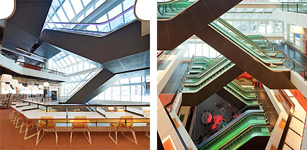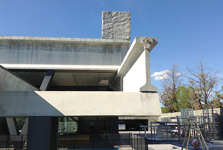 Bovenop de in 2005 opgeleverde constructie rust een ruw gehakt blok natuursteen van twintig ton als tegenwicht en als symbool van de zwaartekracht - de architect noemt het zijn 'G-spot' - die ons leven in architectuur en bouw immers beheerst.