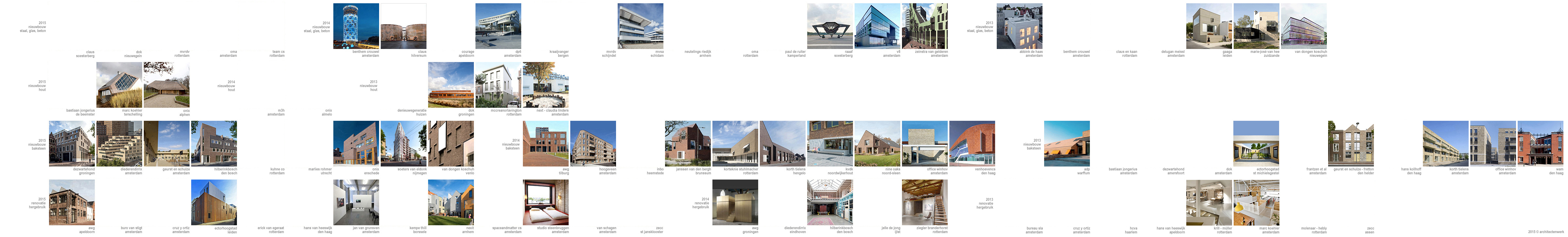 We besluiten met een totaaloverzicht van alle 90 projecten die deze jaarboekredactie tot nu selecteerde en omdat we de smaak van de 'lijstjes' weer te pakken hadden, hebben we ook die hierboven weer in twee vergelijkbare overzichten geplaatst. Op het onderste plaatje [click hier voor een leesbare versie] alle projecten, op het bovenste plaatje [click hier voor een leesbare versie] schrapten we de gebouwen waarvan we menen dat elke willekeurige redactie ze zou hebben opgenomen, zodat de nadere keuze van de actuele redactie resteert. En dan is inderdaad hun voorliefde voor baksteengebouwen te zien die al in het Jaarboek 2012/13 naar voren trad, met name in het interview met Hans Kollhoff [zie onze eerdere recensie onder de titel 'Tussen gebaar en (gesinterde) baksteen']. De keuze sluit ook aan bij de inleiding die Hans van der Heijden hield bij de presentatie van het vorige Jaarboek, waarin hij herhaald meende dat de jaarproductie zich in ieder geval moest verhouden tot 'de oude gewoonten van grote groepen mensen.' Het is de vraag of die specifieke keuze nu ook voldoet aan dat andere criterium dat deze redactie zichzelf stelde, zoals te lezen in de laatste alinea van het meest recente voorwoord: 'Dat alles geldt bij uitstek voor een publicatie als het Jaarboek, dat beoogt een overzicht van best practice te zijn en dat geen reductie is van die praktijk tot een wensbeeld.'