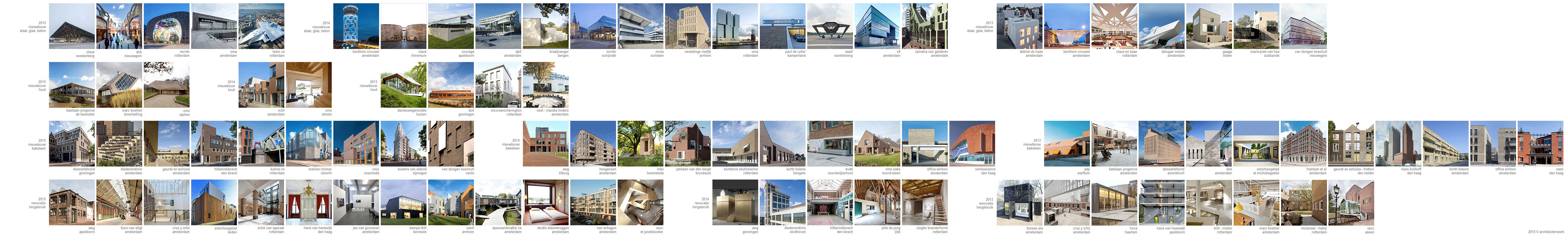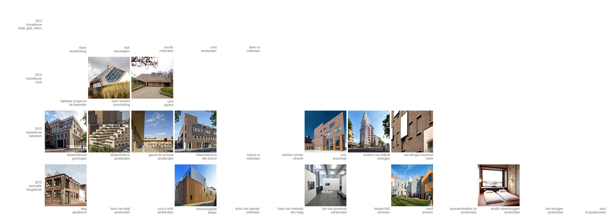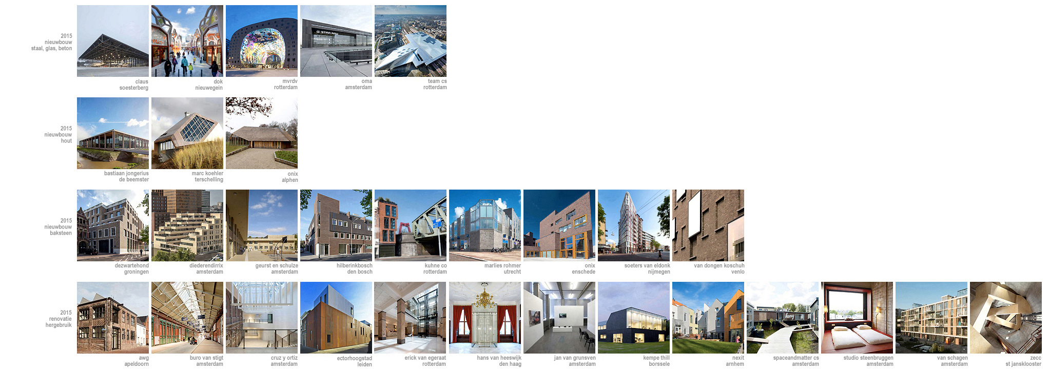 Wat we hebben gedaan is anders dan anders; we hebben uit de selectie van 30 die projecten weggehaald, die waarschijnlijk ook door een anders samengestelde redactie zouden zijn gekozen. Uzelf zou die Markthal, Rotterdam CS en de vernieuwing van het Mauritshuis immers ook hebben opgenomen, nietwaar? En zo stapsgewijs verder zoals te zien in de langzaam leger wordende bovenstaande plaatjes. Tenslotte blijft ongeveer de helft van de projecten over, die dan ook als keuze nog directer aan deze redactie gekoppeld zijn. We hebben de zo overgebleven projecten opnieuw weer even opgenomen in dat schema langs de meetlat van de 'materialiteit', zie hieronder [click op het plaatje voor een grotere, leesbare versie].