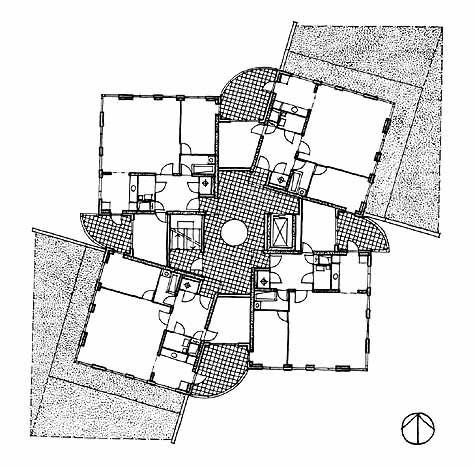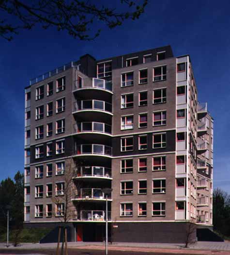 In opdracht van SSN-Vastgoed uit Schiedam (tegenwoordig Bokx Groep) is een plan gemaakt voor een appartementengebouw in Delft. Vier woningen rond een inpandige hal met vide (met bovenlicht) over acht etages met op het dak twee ruime penthouses. Vanwege de mindere bezonning is de noord-oost-woning zodanig weggedraaid uit de orthogonale structuur dat een ruim balkon onstond op het westen; de zuidwest-woning is zodanig weggedraaid dat het door een enorme buurflat beperkte uitzicht werd verruimd. De bergingen zijn op drie plekken op de begane grond gelegen; bij twee daarvan is daar aan de buitenzijde een groen talud tegenaan gelegd. De vierde plek is een begane grond-woning met tuin. (foto: P&G Morisson Den Haag) Voor info is Kavánder' Architectenbureau BNA b.v. snel bereikbaar per E-mail.