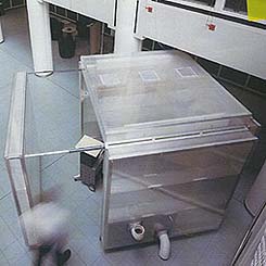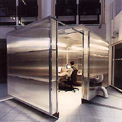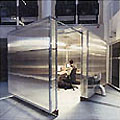 Het principe van de Lite-Box is een vrijstaande, verplaatsbare wisselwerkplek. Door het deurpaneel achter zich dicht te trekken scheidt de gebruiker zich af van de directe omgeving. De apparatuur, die nodig is om de juiste werkomstandigheden in de Lite-Box te regelen, bepaalt in hoge mate het beeld van de studiecabine, omdat deze is opgenomen in de halfdoorzichtige wandconstructie van polycarbonaat platen. Doordat de cabine verplaatsbaar is, kun je die als een kaasstolp over een bestaande werkplek laten zakken, als de behoefte aan privacy daartoe aanleiding geeft.
