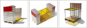 Hoewel het gebouwtje in eerste instantie als uitbreiding is gedacht, kan het natuurlijk ook als zelfstandige satelliet in de tuin geplaatst worden of bijvoorbeeld als separaat atelier in de stad. Vanwege de maten en de simpele manier waarop het geplaatst kan worden [hier op 3 zes meter lange rondhouten palen, met daarop de mogelijkheid van een eenvoudig terras] heeft het gebouwtje geen ingewikkelde funderingsvoorzieningen nodig. Het is als kant en klaar product te koop en wordt per vrachtwagen naar zijn bestemming vervoerd.