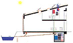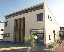 | Woonhuis met atelier Rotterdam Anno 1998 - Hier ziet u het gebouwde resultaat van het eerder gepresenteerde project kantooraanhuis. Het is een zeer duurzaam woon-werk-gebouw geworden met een innovatieve bouwtechniek: wanden, vloeren en een dak van cellenbeton, een materiaal met duurzame en ecologische eigenschappen. We citeren graag een aantal passage's uit een artikel dat over de woning is verschenen in het blad 'Duurzaam bouwen': '- Nog afgezien van de eventuele zonnecellen [PV-panelen] op het dak en de 'gewone' zonneboiler, heeft het gebouw een Energie prestatie Coefficient [EPC] van minder dan 1,2. Dit is voor kantoorruimte bijna 40% lager dan de huidige norm. Van Wijngaarden heeft het plan om uiteindelijk zijn hele dak te voorzien van zonnecellen. Zodat volledig in de eigen stroomvoorziening kan worden voorzien, maar deze investering wil hij geleidelijk aan doen.-' '-Een andere duurzame bijzonderheid is het hergebruik van regenwater [zie tekening]. Vaatwasmachine, wasmachine en de toiletten worden bediend met gezuiverd regenwater. Daartoe is een opslagreservoir van 2000 liter in een kelder onder de woning gerealiseerd. Het regenwater wordt via het dak, met een ringleiding naar dit reservoir afgevoerd, vervolgens gefilterd en naar de tappunten in de woning gebracht. Een Groene Waterleing noemt de leverancier Holland Water het. Dergelijke systemen geven een verwachte besparing van 50% op het waterverbruik. De waterleiding is uitgevoerd in een milieuvriendelijke kunststof en niet in koper. Het dak is niet bedekt met bitumen, maar met een milieuvriendelijke kunststof-folie. Zo komen er geen schadelijke stoffen in het water terecht. Andries van Wijngaarden AVB-BNA - E-mail: wijnarch@xs4all.nl