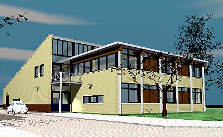 Buurtcentrum in Capelle a/d IJssel [realisatie in het jaar 2001] - Het gebouw is gelegen aan een bestaande woonstraat, grenzend aan een klein park met speeltuin. De bouwvolumen leggen de verbinding tussen deze twee gegevens. Veel daglicht is een vereiste en een multifunctioneel gebruik door buurtactiviteiten en buitenschoolse opvang. Het aan de straat gelegen deel is in twee lagen, het totaal volume is ongeveer 750 m3. Alle ruimten zijn gegroepeerd rond een open hal die tevens dient als ontmoetingsplaats. Door gebruik van vouwwand, kleine lift en bar kunnen gelijktijdig zeer verschillende gebruikersgroepen dit gebouw benutten.