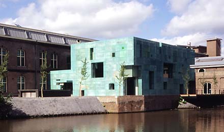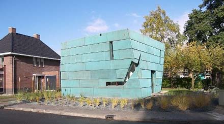 Lagerwaards huis is opgebouwd als een kubus van 10 x 10 x 10 meter, waarbij een deel is verzonken in de grond. Vervolgens is er een geperforeerde koperen huid omheengezet waarin de verdraaiing in de stedebouwkundige situatie op de hoek is opgenomen. Het beeld dat zo ontstaat is niet uniek, maar zeker interessant en eigentijds. De eerste keer dat een dergelijk gevelmateriaal als voile om een gebouw werd toegepast was bij het in 2000 opgeleverde kantoor van woningbouw corporatie Het Oosten aan de Sarphatistraat in Amsterdam, dat werd ontworpen door de Amerikaanse architect Steven Holl [zie foto onder].