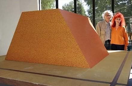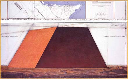 In het Franse Saint-Paul presenteerde het kunstenaarsduo Christo en echtgenote Jeanne-Claude vorige week de maquette [zie foto boven] en tekeningen [zie hieronder] van hun Mastaba-project dat geheel is samengesteld uit olievaten. Het enorme bouwwerk wordt gebouwd in - en betaald door - Abu Dhabi. Het ontwerp dateert al van 40 jaar geleden, maar kwam nooit eerder tot realisatie, onder meer vanwege de oorlog tussen Iran en Irak.