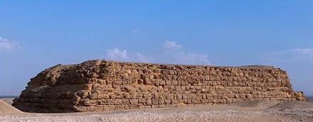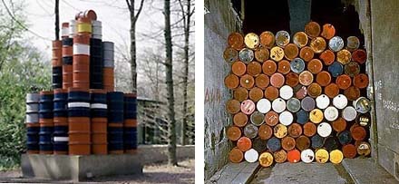 De Mastaba ontleent zijn naam aan oude Egyptische grafmonumenten [zie hierboven]. De nieuwe Mastaba van Christo bestaat uit ruim 390.000 horizontaal gestapelde oliedrums en wordt meer dan 150 meter hoog, 225 meter diep en zo'n 300 meter breed. Christo werkte al eerder met de oliedrum als element, onder meer in muren [zie foto rechtsonder in Parijs] en als vertikale stapels; het Museum Kroller Muller heeft een beeld van 56 olievaten in haar beeldentuin [zie foto linksonder] en in 1999 bouwde hij een tijdelijke muur van 13.000 olievaten in Oberhausen.