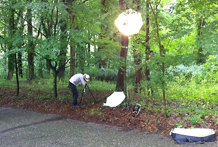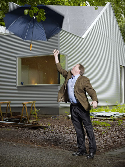 Ditmaal kwam documentair- en portretfotograaf Roger Cremers op bezoek. Het was een regenachtige dag in het bos en dus eerst bij de koffie gedachten delen over de opzet. Ons nieuwe huis zou de achtergrond moeten vormen in een staande foto, en dus installeerde Roger zijn camera met bijbehorend flitsstatief in het nog nadruppelende bos aan de overzijde [zie foto boven]. De eerste serie kon na een half uur richten, belichten en instellen beginnen. Vanwege de druppels in de wind en de buitjes tussendoor stond ik met een paraplu in mijn handen, die op onderstaande foto een rol speelt als wandelstok en fysieke steunpilaar. Cremers was echter niet tevreden over de statische manier waarop ik op de plaat kwam en dat werd er gedurende die serie niet beter op.