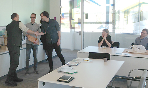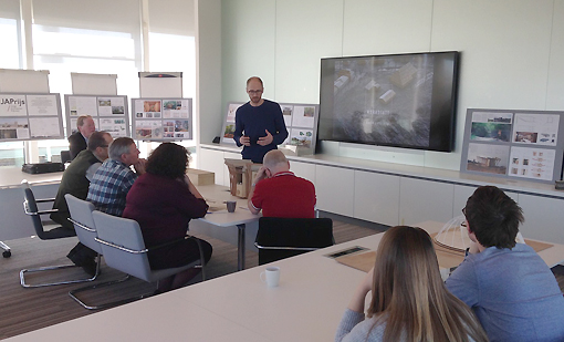 ^ Het juryberaad, met v.l.n.r. Gerard van der Ham, Mark Kras, Debbie Kamphuis en Ruud Ruis Na het beraad bedankt Mark Kras namens de jury alle deelnemers voor de intensieve en creatieve inspanningen. Deze jury heeft vooral gelet op de meer praktische kanten van de ontwerpen in relatie tot het doel van de opgave: een verplaatsbaar ontvangstgebouw met de gevraagde flexibele gebruiksmogelijkheden. Ook de overkoepelende vraag 'Met wie willen we straks nou echt aan de slag?' kwam bij de uiteindelijke keuze aan de orde.