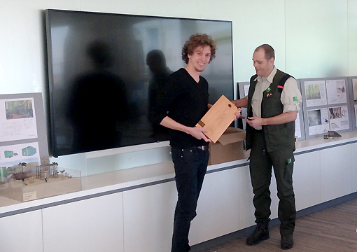 ^ En hier de overhandiging door Mark Kras aan Anton Zoetmulder voor het plan Natuurtribune Wij danken de facilitaire afdeling van Staatsbosbeheer, samen met Judith Hendriks van Hollands Duin, hartelijk voor de organisatie van deze gastvrije ontvangst in Amersfoort. En we houden u op de website op de hoogte van het inhoudelijke vervolg. Staatsbosbeheer gaat nu intern en extern op zoek naar het budget voor uitwerking van de drie geselecteerde ontwerpen.