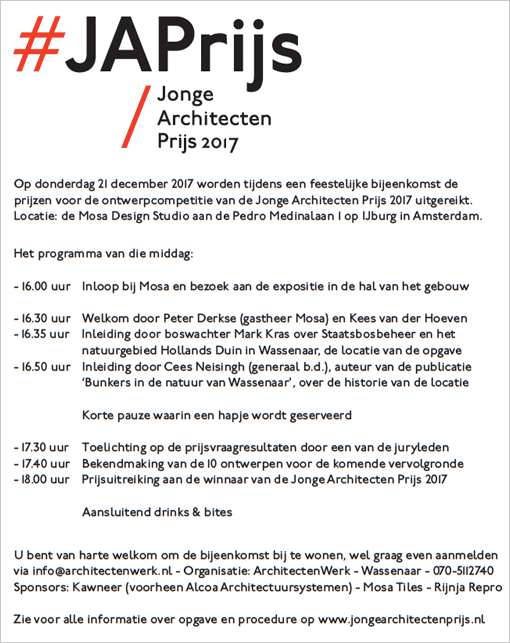 Expositie en prijsuitreiking Alle inzendingen worden opgenomen in een tentoonstelling die op donderdag 21 december 2017 - gecombineerd met de feestelijke prijsuitreiking - zal worden geopend op onze vaste ontvangstlocatie, de > Mosa Design Studio op IJburg in Amsterdam. Uiteraard zijn de winnende ontwerpen straks ook te zien op deze website en worden ze prominent gepresenteerd door onze trouwe mediapartner > Architectenweb.