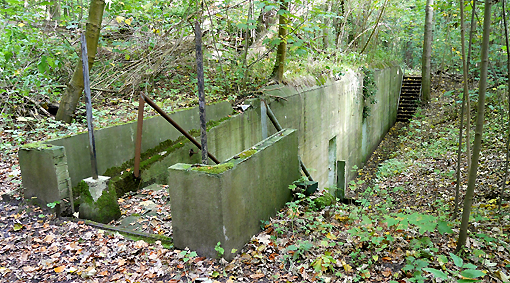 ^ De verzonken entree van een van de vijf grotere bunkers in het bos van Rijksdorp